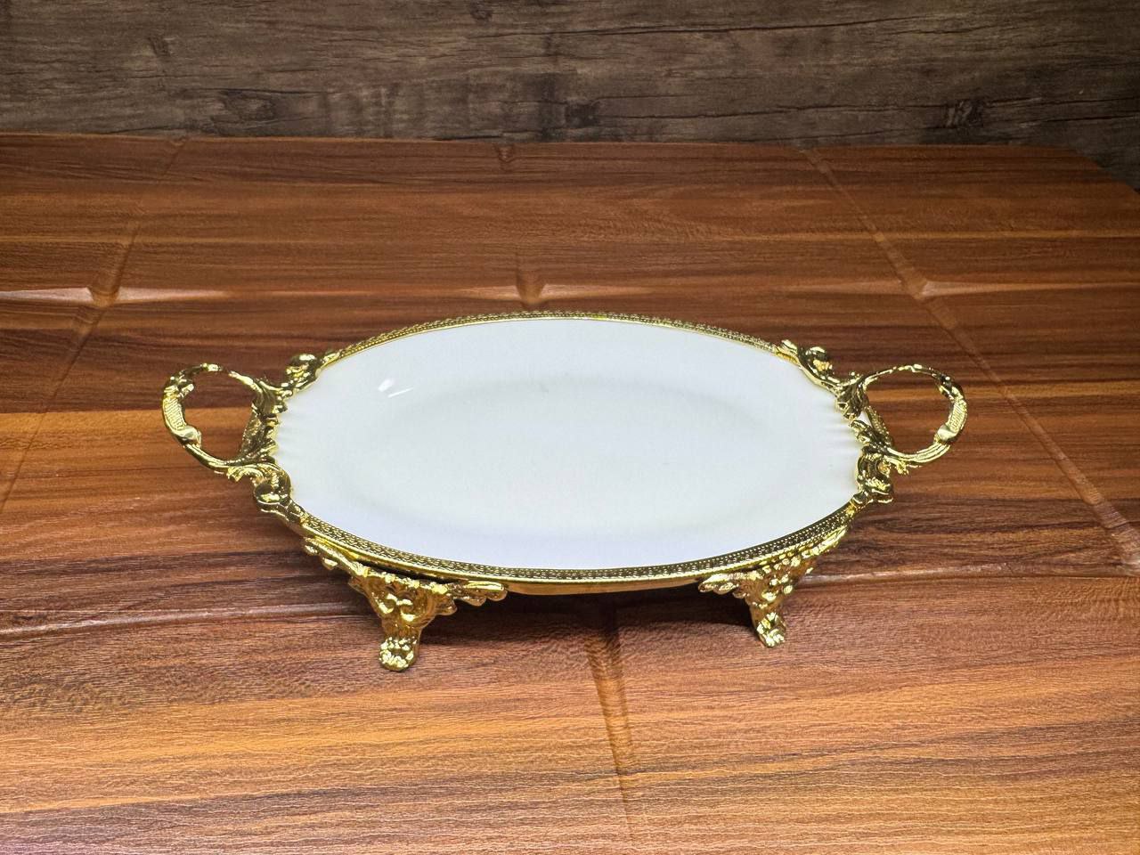 دیس بیضی قطر ۲۴ cm مناسب شکلاتخوری و.... استفاده شده از چینی درجه عالی و نواری و دسته و پایه از آلیاژ برنج هستش